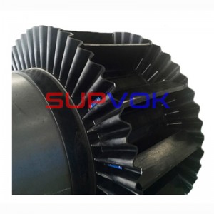 The framework material adopts polyester cotton impregnated canvas (EP canvas and steel rope core) and transverse rigid reinforcement layer. The transverse rigid reinforcing layer is useful to solve the collapse of conveyor belt with large side wall.